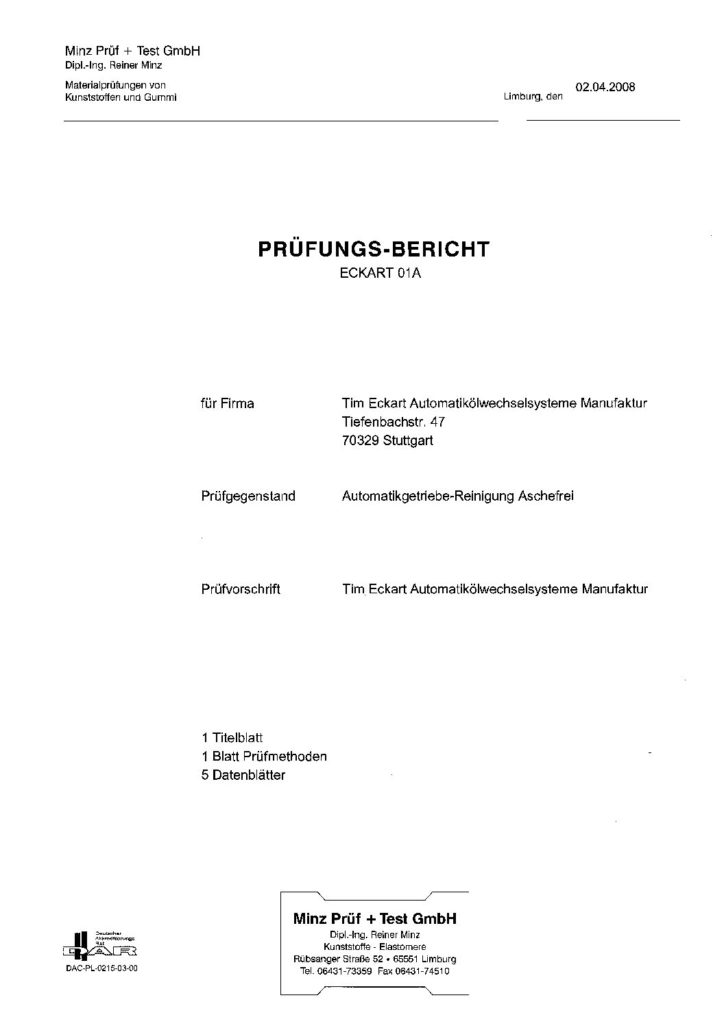 Automatikgetriebereiniger der Firma Minz Prüf + Test GmbH, in Bezug auf die Auswirkung auf die Elastomere im Automatikgetriebe.